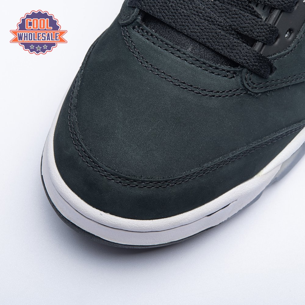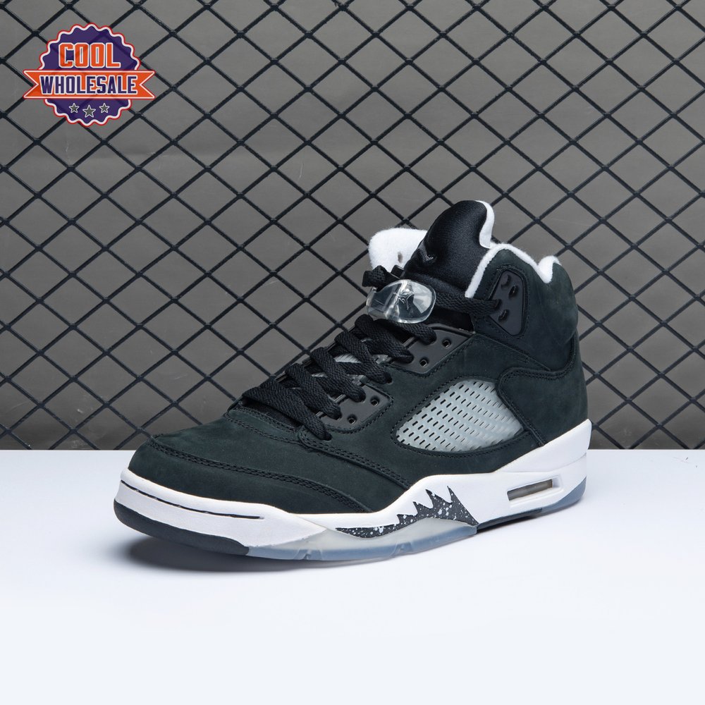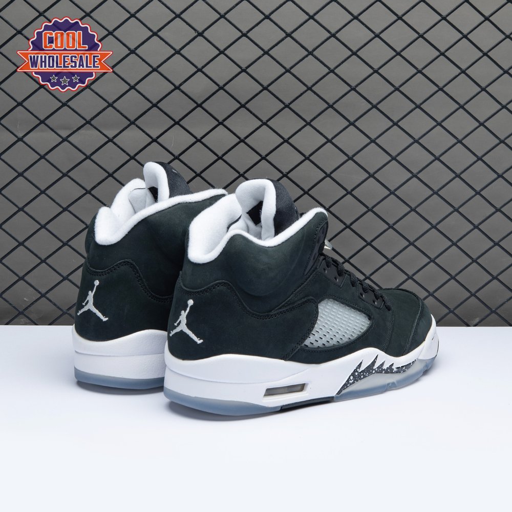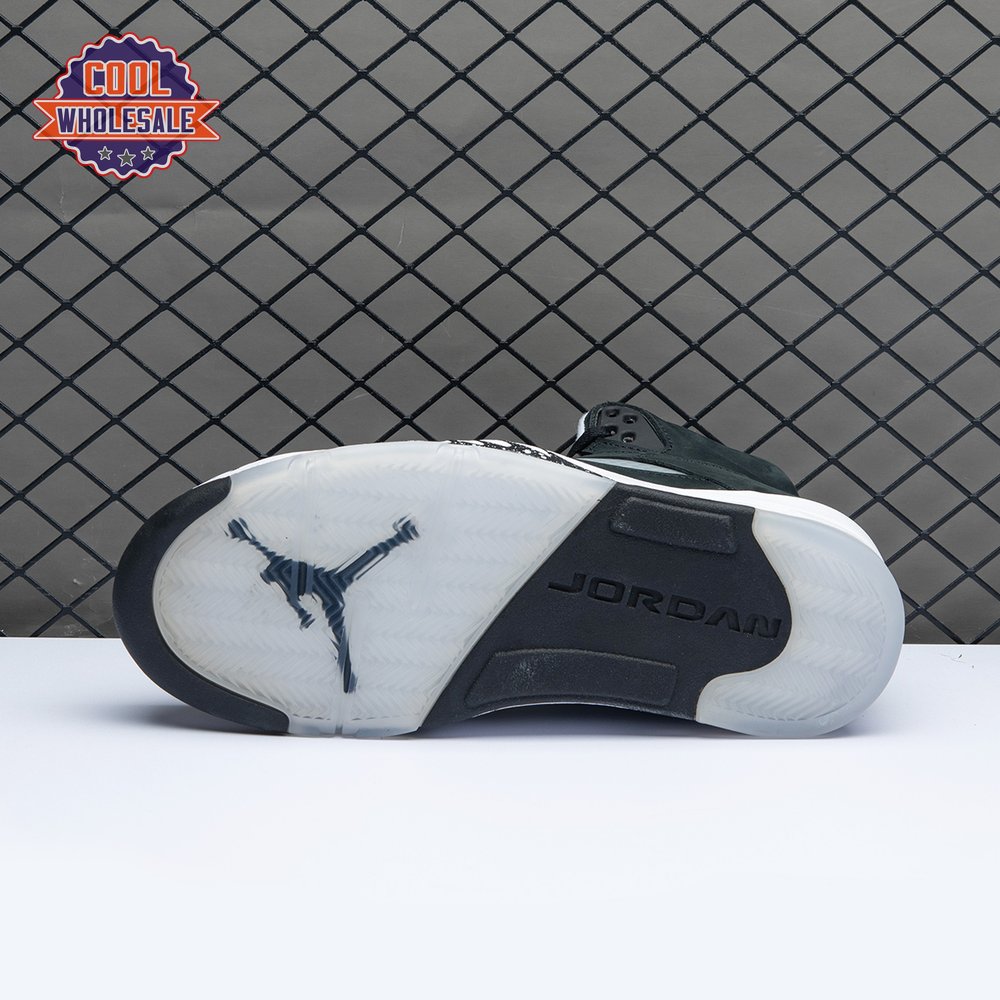 The 2021 edition of the Air Jordan 5 Retro "Oreo" 2021brings back a simple two-tone colorway first released in 2013. The build is faithful to the original, featuring a black suede upper with tonal TPU eyelets, translucent quarter panel netting and a grey Jumpman embroidered on the tongue. Contrasting white hits appear on the collar lining, interior tongue and Jumpman heel branding. The mid-top sits on a white polyurethane midsole with a visible Air unit nestled in the heel and black shark-tooth detailing dusted in white speckles. Underfoot, an icy rubber outsole delivers stop-and-go traction.