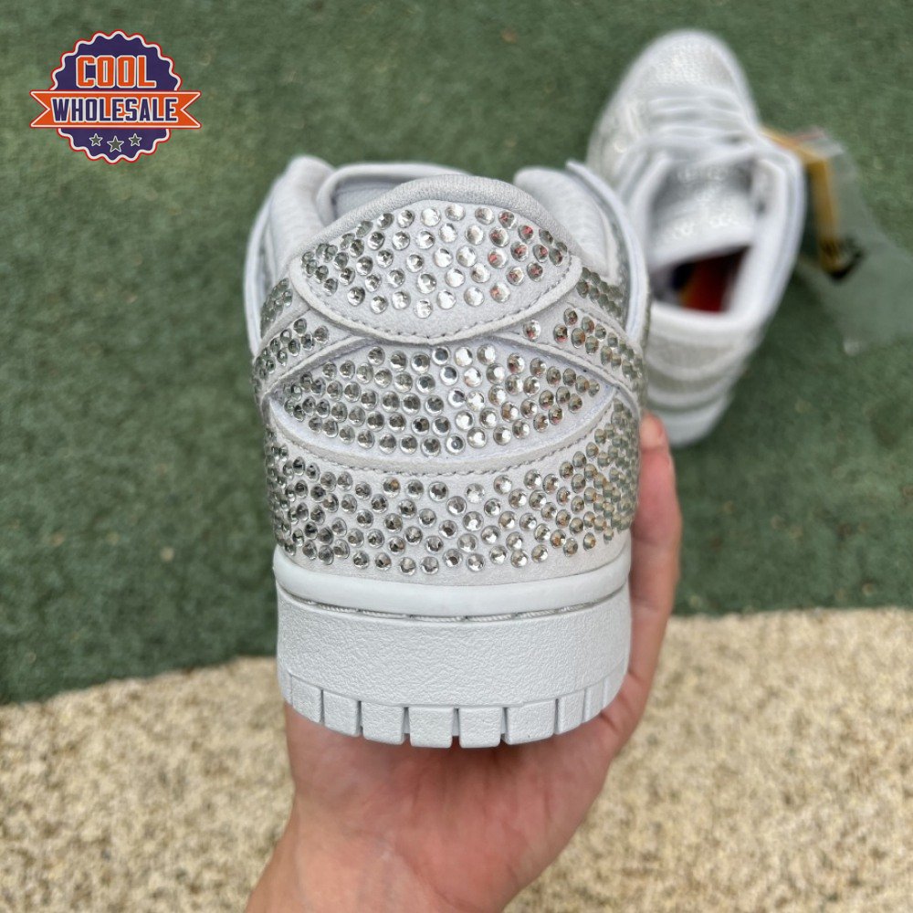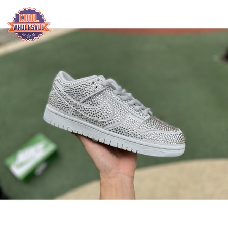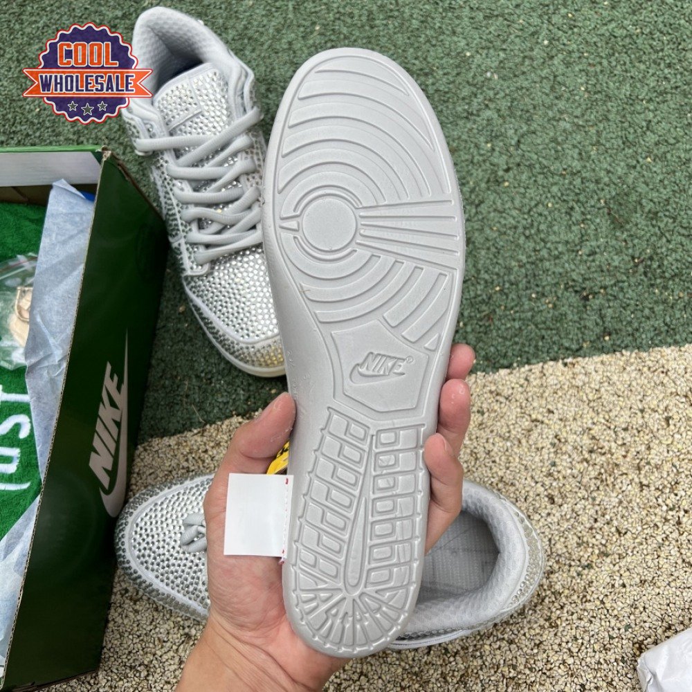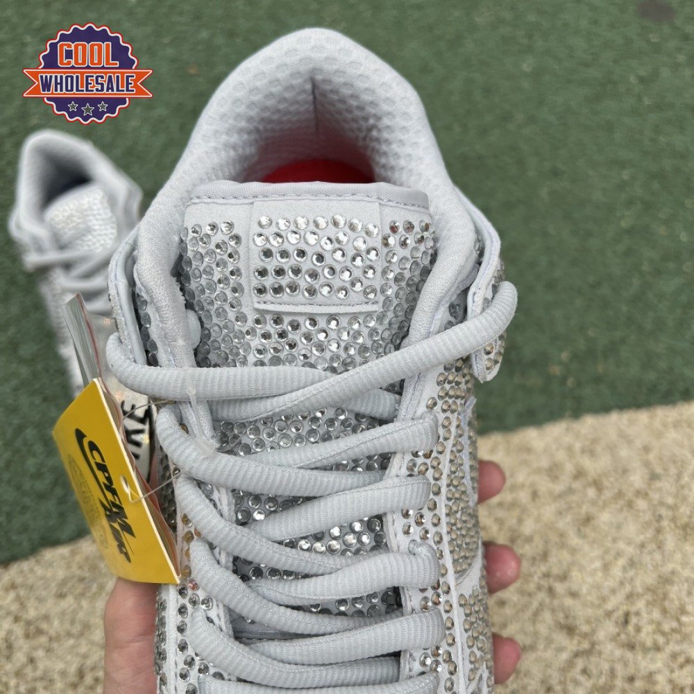 Designed in partnership with the LA-based streetwear brand, the Cactus Plant Flea Market x Swarovski x Nike Dunk Low "Pure Platinum" delivers an opulent take on the classic silhouette. Every inch of the suede upper is entirely covered in Swarovski crystals, including the detachable double lace flaps, heavily padded tongue and oversized Swoosh, the latter borrowed from CPFM"s previous Nike Blazer collaboration from 2019.