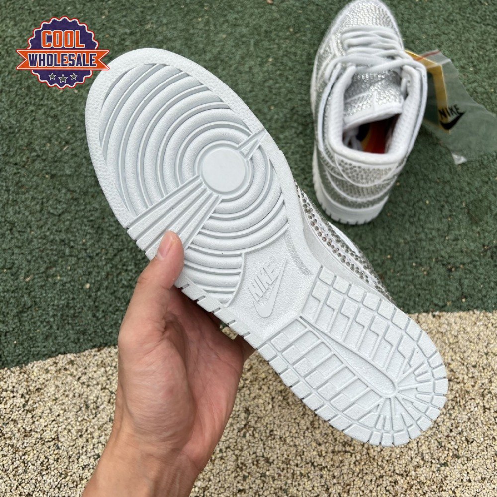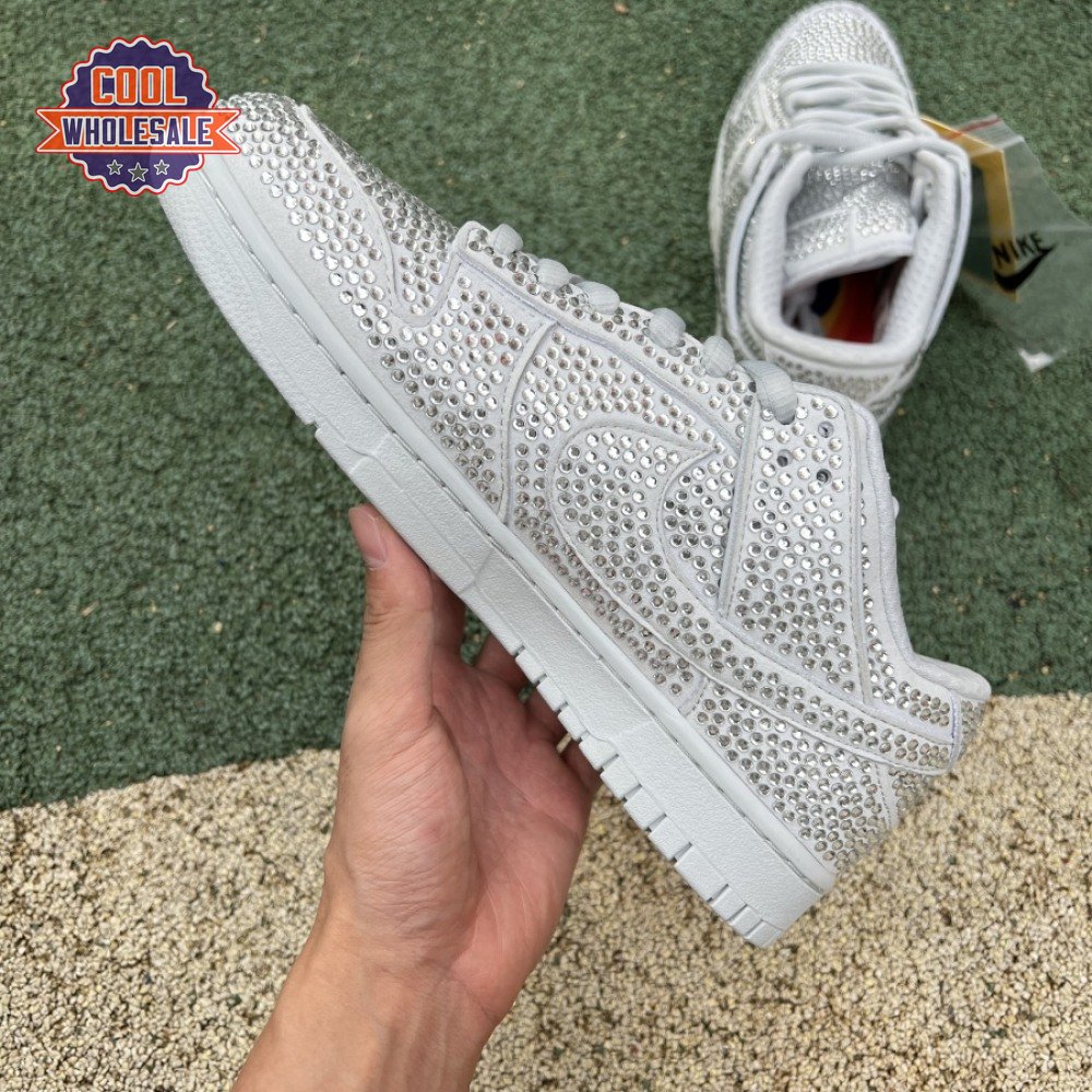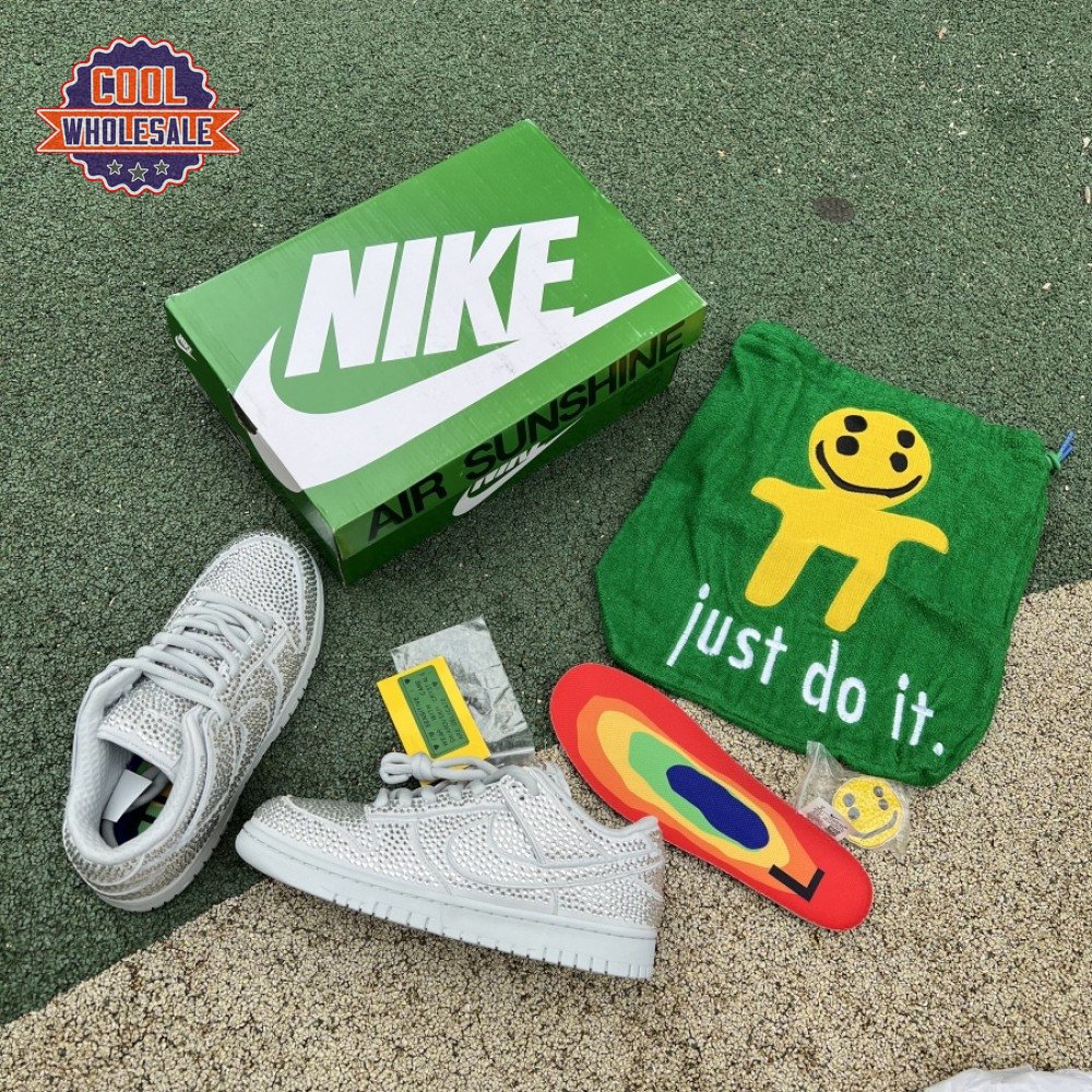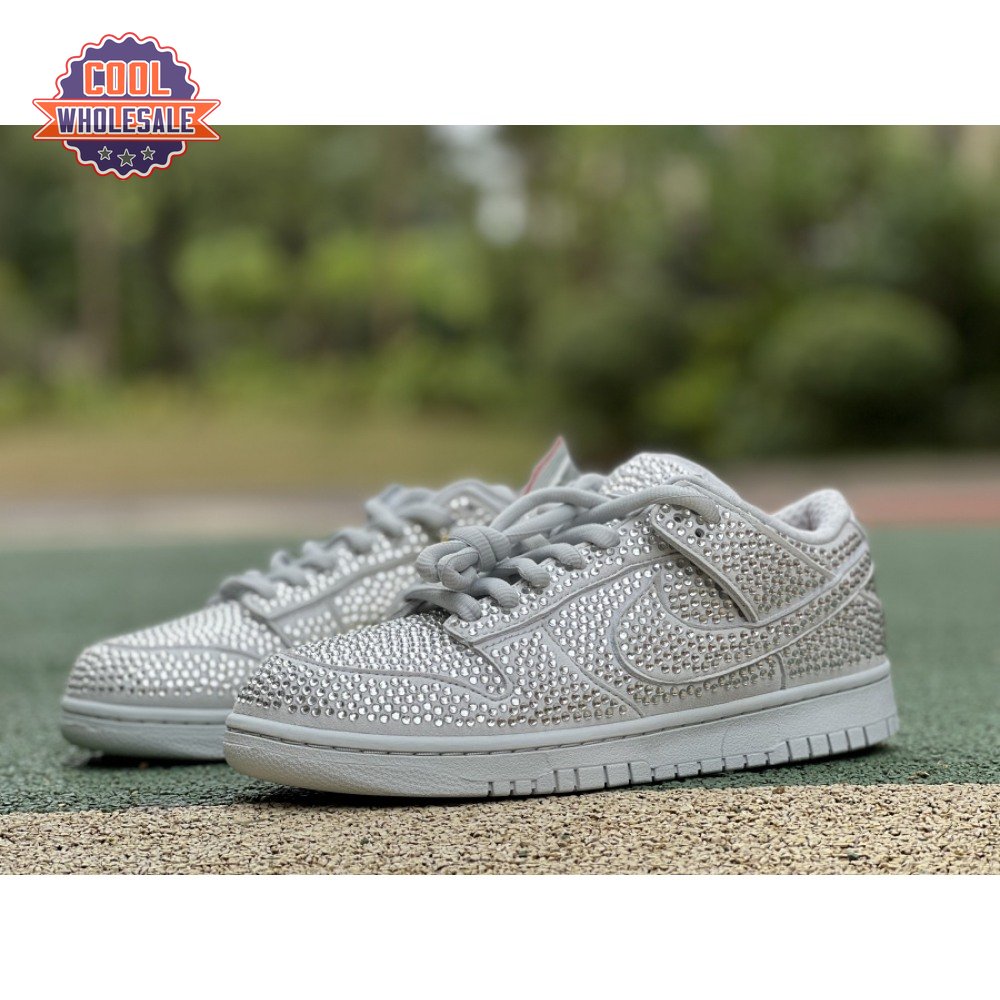 Designed in partnership with the LA-based streetwear brand, the Cactus Plant Flea Market x Swarovski x Nike Dunk Low "Pure Platinum" delivers an opulent take on the classic silhouette. Every inch of the suede upper is entirely covered in Swarovski crystals, including the detachable double lace flaps, heavily padded tongue and oversized Swoosh, the latter borrowed from CPFM"s previous Nike Blazer collaboration from 2019.