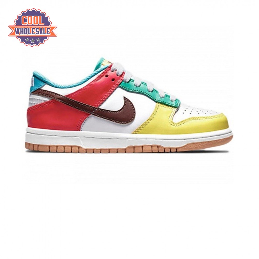 The Nike Dunk Low SE "Free.99 - Black" applies mismatched color blocking to the vintage hoops shoe turned streetwear staple. Both the left and right shoe feature a black leather base on the upper, supported by a crisp white midsole and pale orange rubber outsole. While the overlays on each shoe are arranged in asymmetrical fashion, they draw from the pastel palette of powder blue, pink, yellow and line green hues. The custom sockliner displays "Free.99" price stickers.