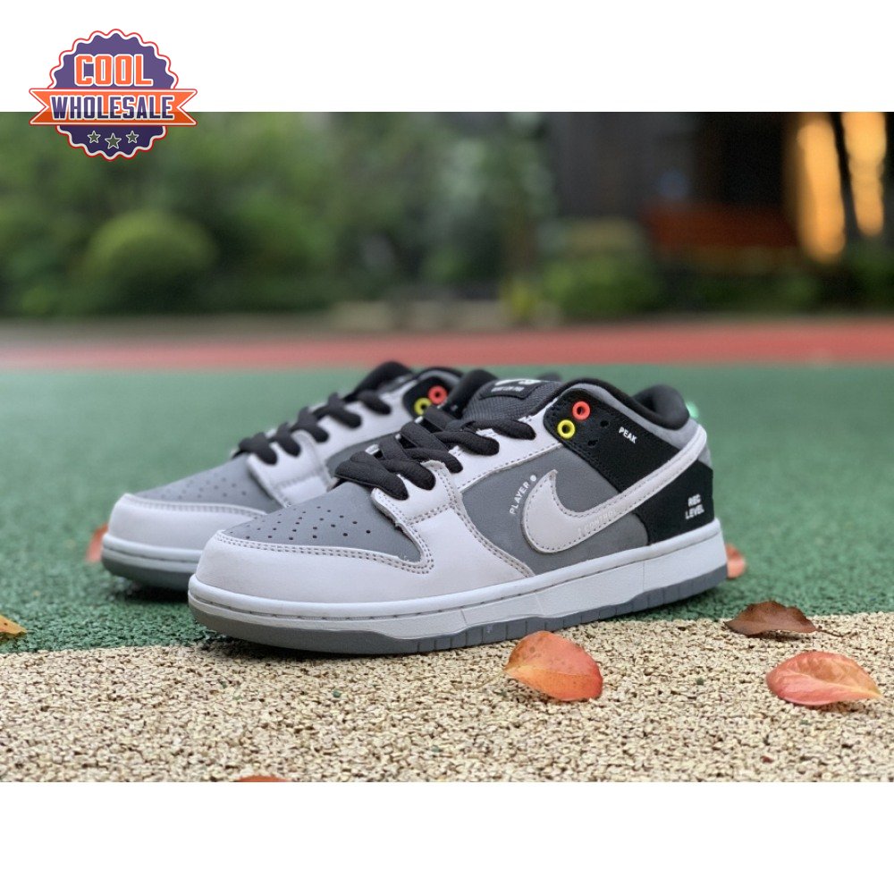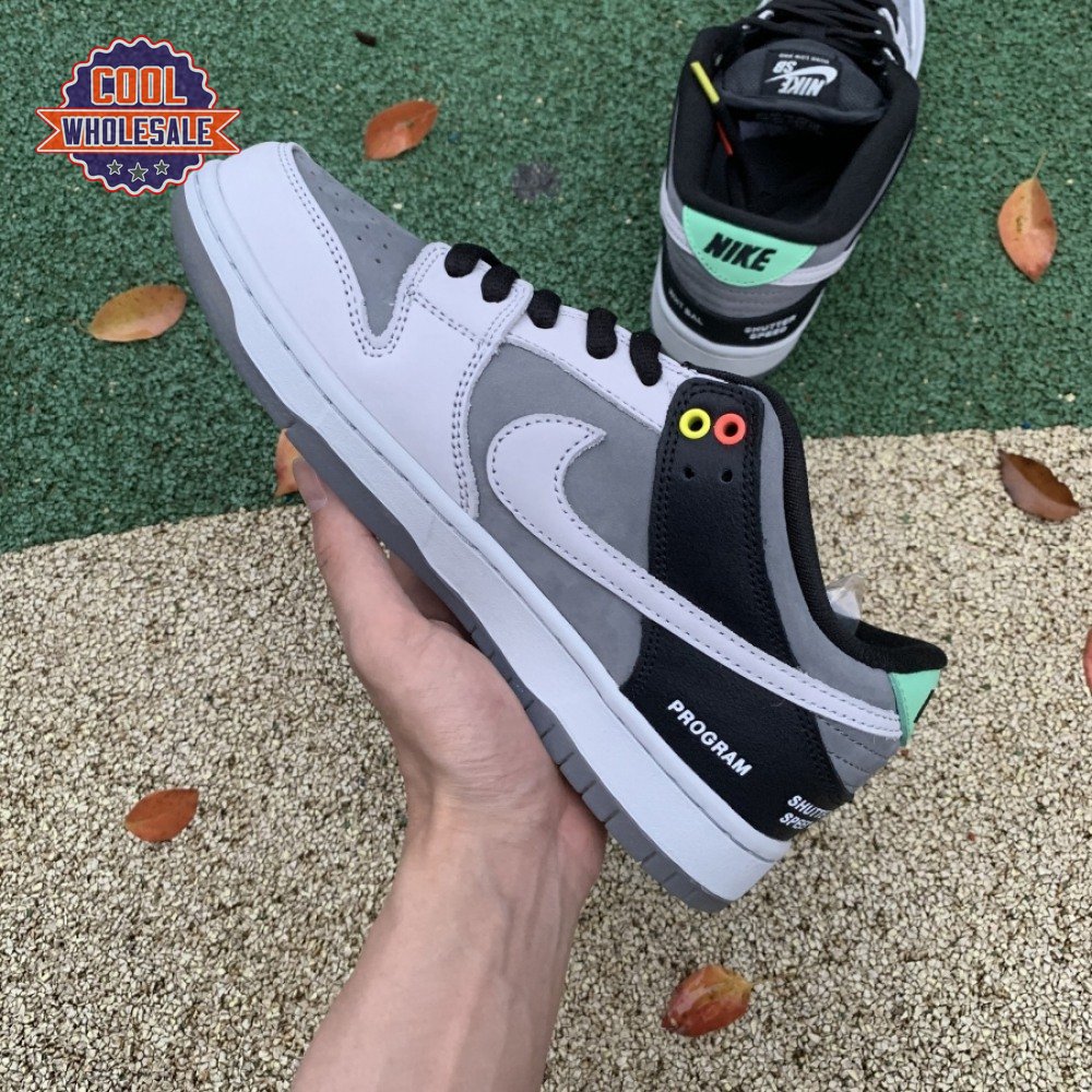 The Nike Dunk Low SB "Camcorder" takes inspiration from an iconic piece of equipment that was instrumental in the proliferation of skate videos in the "90s: the Sony DCR VX1000 camcorder. The low-top makes use of a charcoal nubuck upper, accented with a lighter shade of grey on the forefoot overlay and signature Swoosh. The black synthetic leather heel overlay is embellished with a series of camcorder functions, including "SHUTTER SPEED" and "REC LEVEL." Red and yellow eyelets, along with a mint green heel tab, add subtle pops of color to the neutral color scheme.